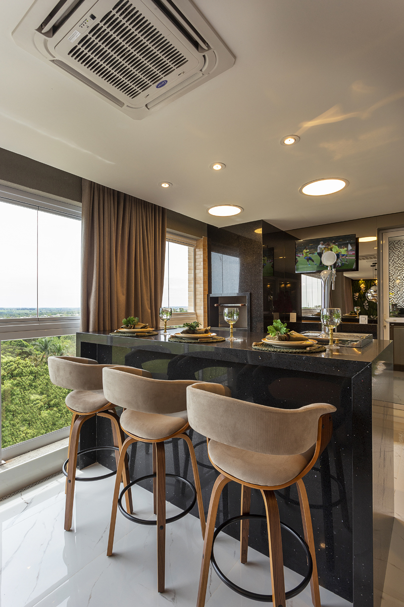 A designer Iara Kílaris, que assina toda a decoração de interiores, idealizou seis pendentes acima da mesa para promover a iluminação direta. Churrasqueira, pia e chopeira complementam o espaço, que está separado da área social do imóvel por grandes portas de vidro e cortinas e completamente voltada para uma bela vista.