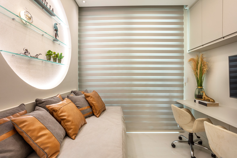 A bancada de trabalho acomoda bem de duas a três pessoas, e um armário instalado na parede organiza o material de escritório. Se necessário, o ambiente também pode ser usado como quarto de hóspedes.
