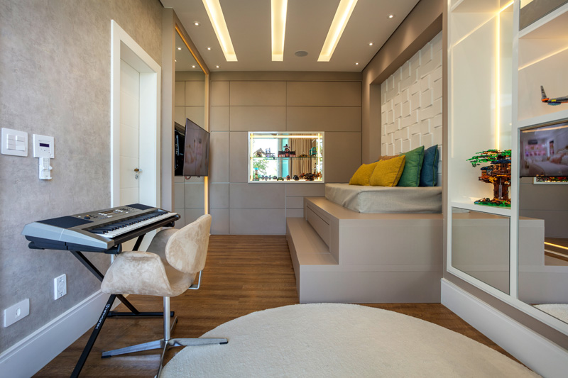 Na Casa São José, assinada pelo arquiteto Aquiles Nícolas Kílaris, o projeto de um quarto de brincar levou em conta funcionalidade e harmonia de formas e cores. É importante ainda que o ambiente esteja localizado próximo ao convívio dos adultos, para que o monitoramento seja constante. Nesta casa, ela na ala íntima do piso superior.