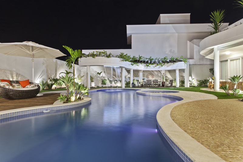 A piscina foi projetada em formato orgânico e é acompanhada de um spa, deck e uma queda d´água instalada no pergolado construído ao seu lado. Ao redor da piscina foram colocadas poltronas tipo ostra e espreguiçadeiras, criando cantinhos para descanso e relaxamento.