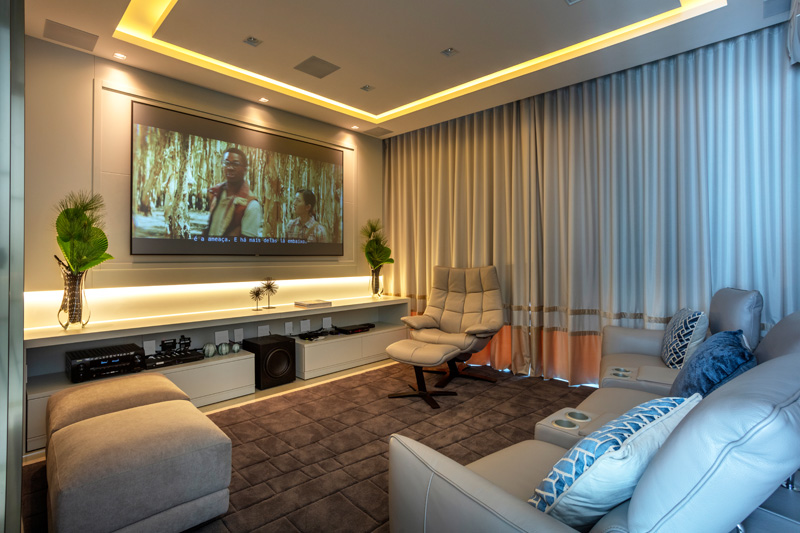 Projetada em tons claros, essa sala de cinema conta com um sofá importando com o melhor couro do mundo e sistema de touch extremamente confortável. O carpete é muito macio e acomoda bem quem deseja sentar ou deitar no chão. O painel que acomoda a tela é todo iluminado e abrindo a cortina é possível contemplar a área de lazer paradisíaca da casa.