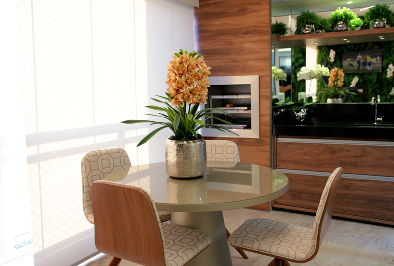 Do outro lado o gourmet, com mesa e cadeiras, área molhada com cuba e churrasqueira, tudo com vista para a cidade. O ambiente está integrado com a cozinha e sala de jantar, sendo separado apenas por uma grande porta de vidro.