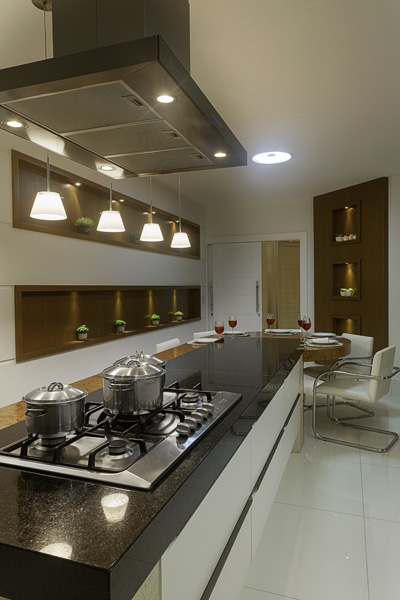 Uma grande bancada de trabalho foi integrada a uma mesa de almoço, possibilitando ao “chef” convívio total com as família e amigos. O home office, apesar de compacto ganhou funcionalidade e aproveitamento de todos os espaços, com nichos e gaveteiros instalados nos painéis da parede.