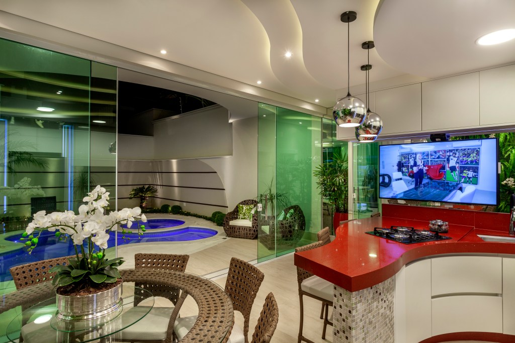 A Casa Diamante, assinada pelo arquiteto Aquiles Nícolas Kílaris, foi projetada com uma área de lazer paradisíaca. Por isso mesmo, todos os ambientes internos tem este espaço como cenário.