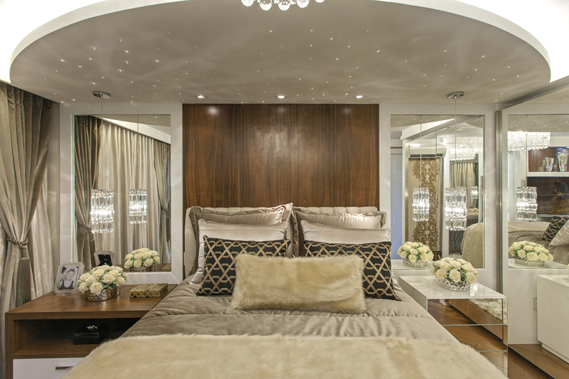 Na área íntima encontramos duas suítes, a de hóspedes e a máster. Na suíte máster, o destaque fica por conta da cabeceira da cama feita em madeira, laca e espelho, conferindo sofisticação e amplitude ao espaço (destaque na foto).