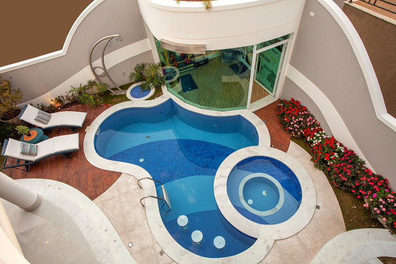 Na Casa Safira, assinada pelo arquiteto Aquiles Nícolas Kílaris, grandes portas de vidro, promovem a integração dos ambientes internos e externos e toda a beleza das montanhas no entorno da propriedade é cenário para os espaços da residência. Construída em um terreno com declive, a área de lazer é composta por um espaço gourmet, piscina em formato orgânico, spa e academia toda envidraçada, com vista para a piscina.