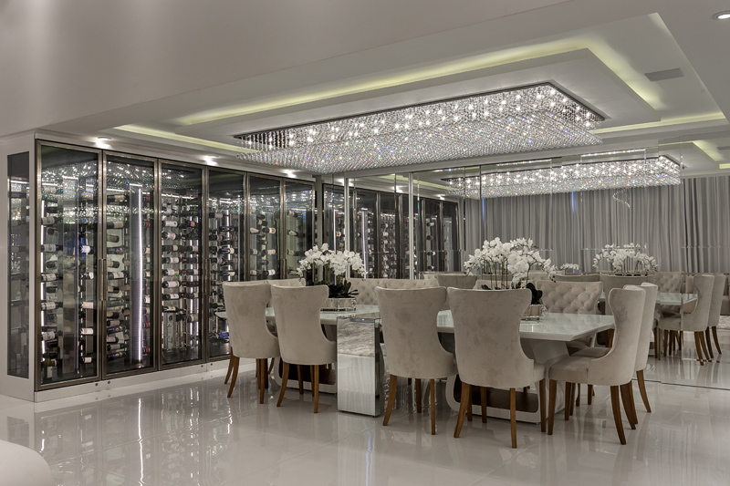 No Apartamento Morumbi, a grande adega branca semelhante as usadas em restaurantes – em forma de armário – está localizada na sala de jantar, facilitando o serviço no momento das refeições. O ambiente é todo claro, incluindo a mesa de jantar com 12 lugares, piso e teto.