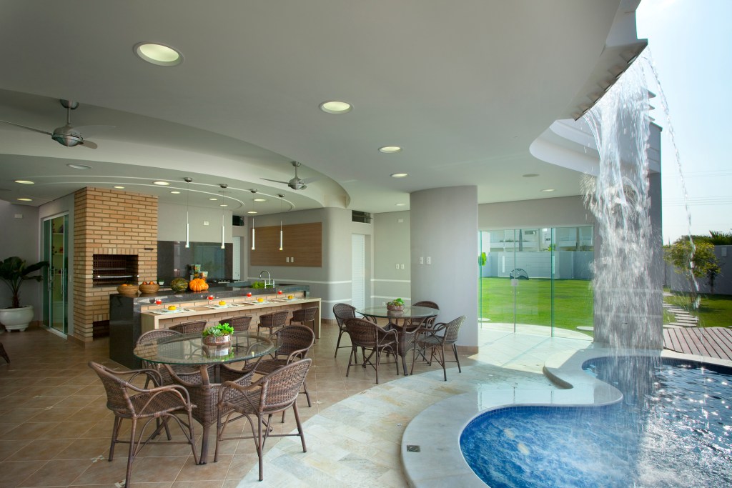 A piscina, em formato orgânico, invade o espaço gourmet, conferindo a sensação de um barzinho a beira mar, onde a água chega próxima às cadeiras. Nesta área, há outra viga em forma de cascata, que refresca o ambiente e concebe barulho de cachoeira e movimento à piscina.