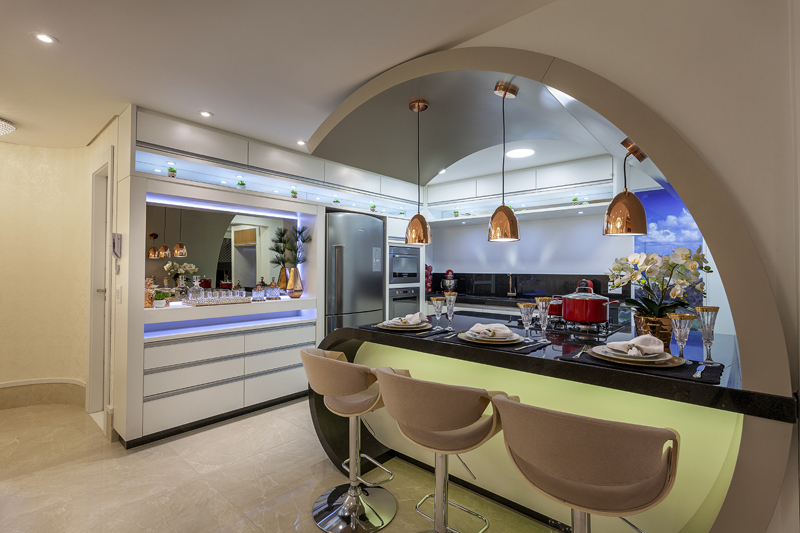 A área social é ampla e aberta, completamente integrada. A única delimitação é a da cozinha, feita por uma bancada larga de forma diferenciada, com um grande arco superior. Banquetas confortáveis foram colocadas na bancada para refeições rápidas.