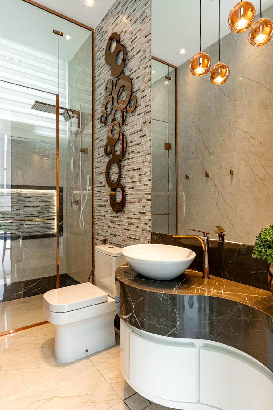 O vestiário idealizado no lazer, atende tanto as pessoas que estão na piscina como na área gourmet, sem a necessidade de entrar dentro da casa. Na parede revestimento com uma composição natural, com conchinhas de verdade e uma grande escultura na parede. Box com chuveiro e bancada curva para a cuba complementam o espaço.