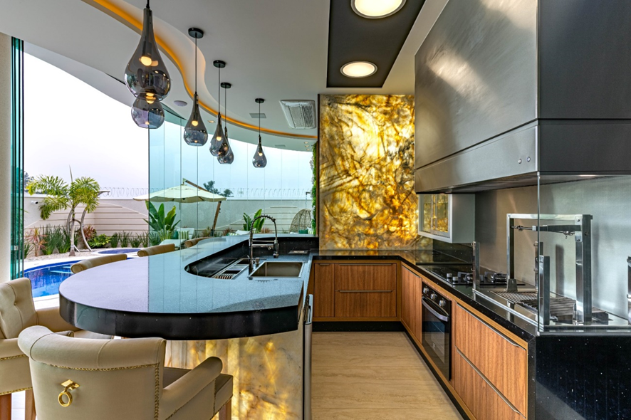 Banquetes confortáveis foram colocadas para acomodar os convidados ao redor da bancada e uma pedra amarela iluminada foi usada como painel na parede do gourmet e também na base da bancada, conferindo sofisticação ao espaço. Pendentes e forma de gota acima da bancada, proporcionam iluminação focada e direta.