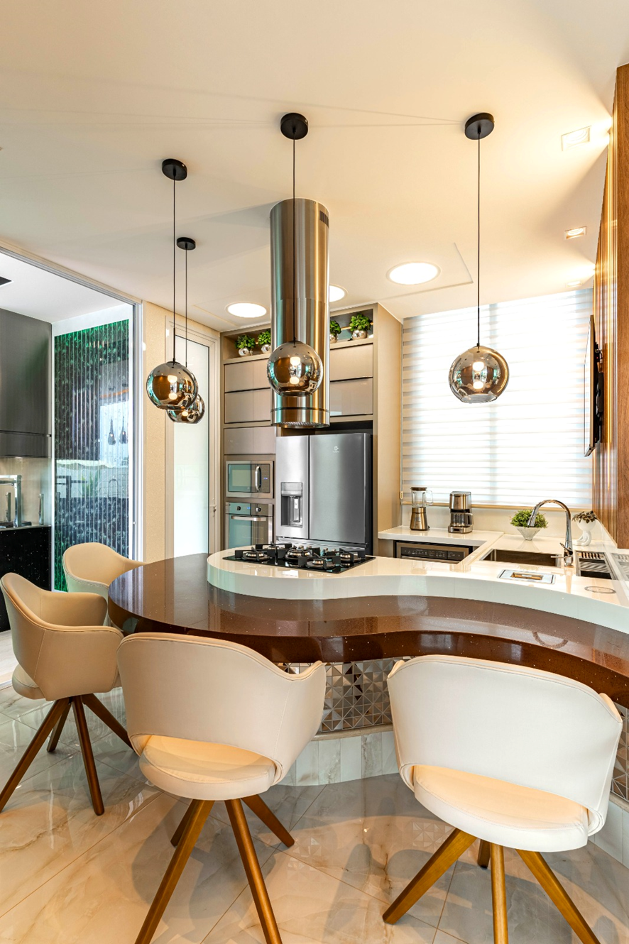 Na Casa Preciosa, A cozinha, com integração direta ao espaço gourmet, foi projetada com uma bancada de refeição e ilha de cocção em branco e marrom. Ela conta também com uma parte funcional de geladeira, pia e microondas. Ao fundo, um painel ripado com efeitos de luz e uma TV.