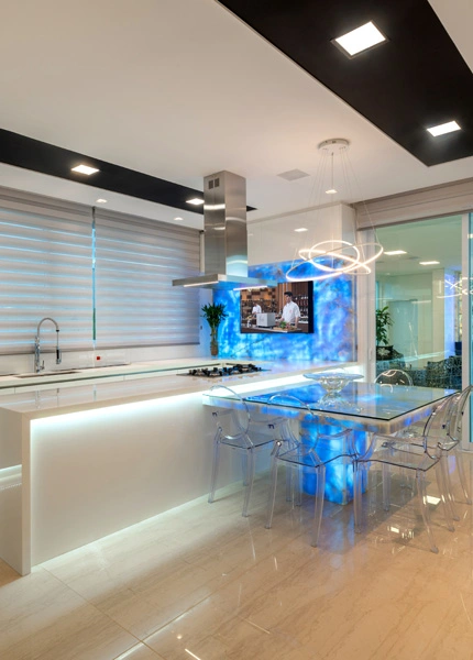 O grande destaque deste ambiente é pedra azul iluminada que reveste a mesa de refeição e a parede lateral da cozinha, que recebeu uma TV. Cadeiras transparentes complementam a mesa de refeições.