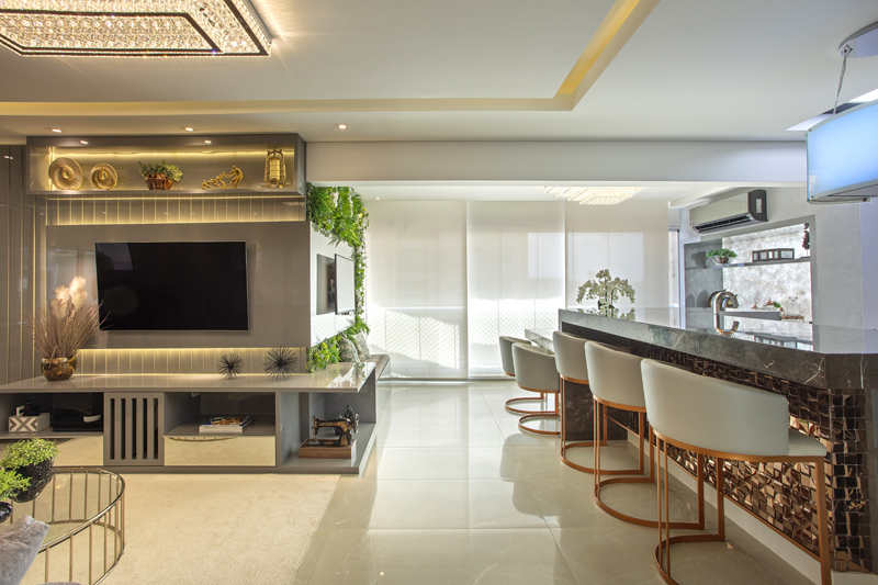 No Apartamento Armani, que tem projeto assinado pela designer Iara Kílaris, o living está separada da cozinha por uma bancada de trabalho que também funciona para refeições rápidas. A cristaleira iluminada recebeu copos e taças especiais. A integração foi idealizada para aumentar a amplitude e sensação de bem-estar no imóvel.