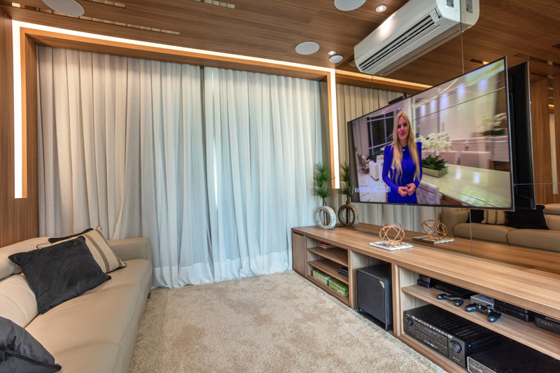 Quando necessário, grandes painéis de espelhos bisotados isolam do living do cinema, ambientando em madeira e tom pastel, com pitadas de preto na decoração. A área de lazer completa também é o cenário principal para todos os estes espaços, graças a integração proporcionada pelas portas de vidro.