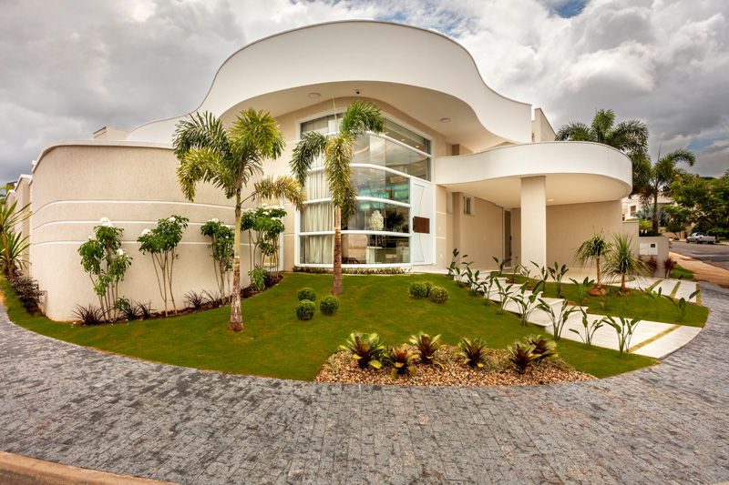 Mesmo sendo térrea, ela foi concebida pela arquitetura das curvas com pé direito duplo, o que conferiu imponência e requinte ao imóvel. O terreno de esquina compacto acomodou perfeitamente a construção, com todos os desejos da família.