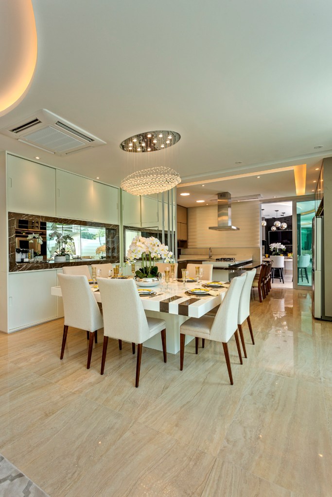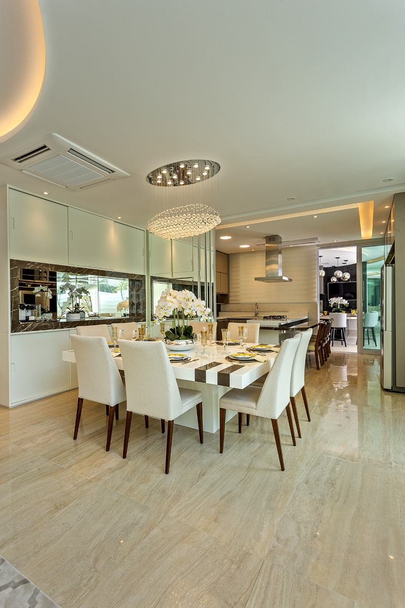 A mescla do “jeito Kílaris de projetar” – que valoriza linhas curvas e formas orgânicas – com arquitetura neoclássica – repleta de colunas e frisos – foi usada na concepção da Casa Clássica, assinada pelo arquiteto Aquiles Nícolas Kílaris. O imóvel com pé direito duplo é impactante, imponente e harmonioso.