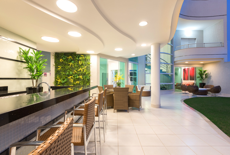 Este espaço possui churrasqueira, parede viva com plantas permanentes, gramado, gazebos para relaxamento e espaço de convivência. Todos os móveis possuem estofados em couro naval que resiste ao sol e a chuva.