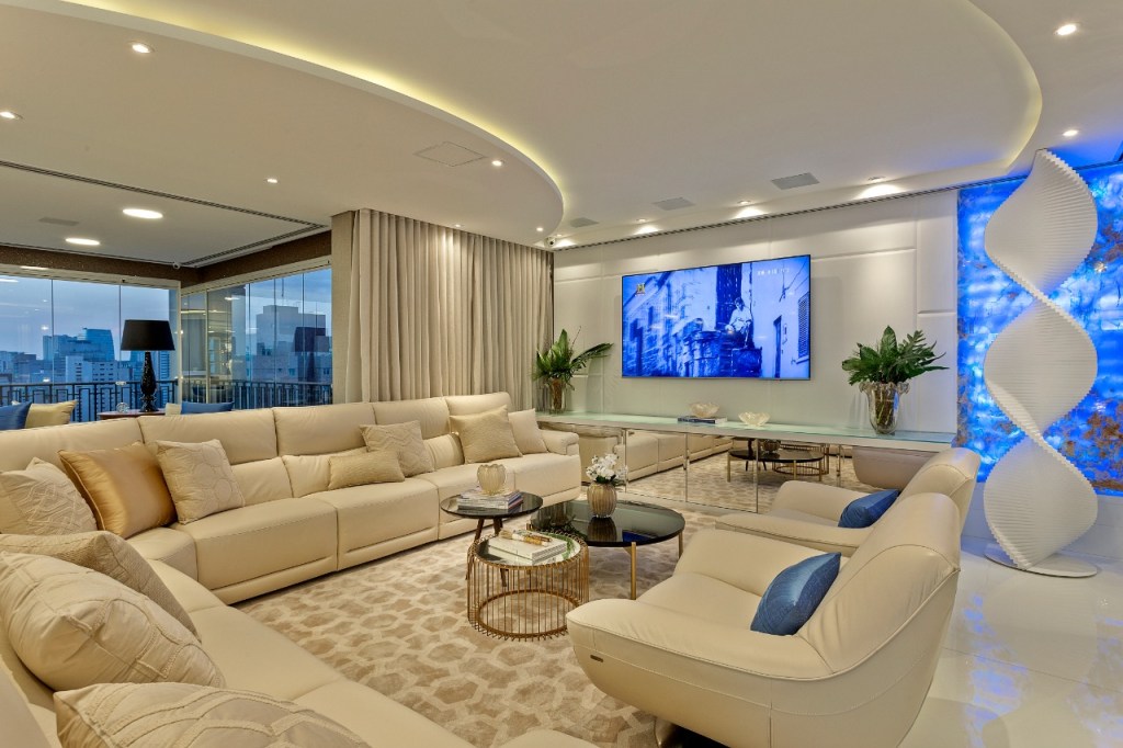 A varanda envidraçada envolve a sala e oferece uma visão panorâmica da cidade, além de permitir uma integração realmente única entre os ambientes. Na área social – formada por espaços de estar, multiuso, jantar, gourmet e varanda – a integração vai além da ausência de divisórias.