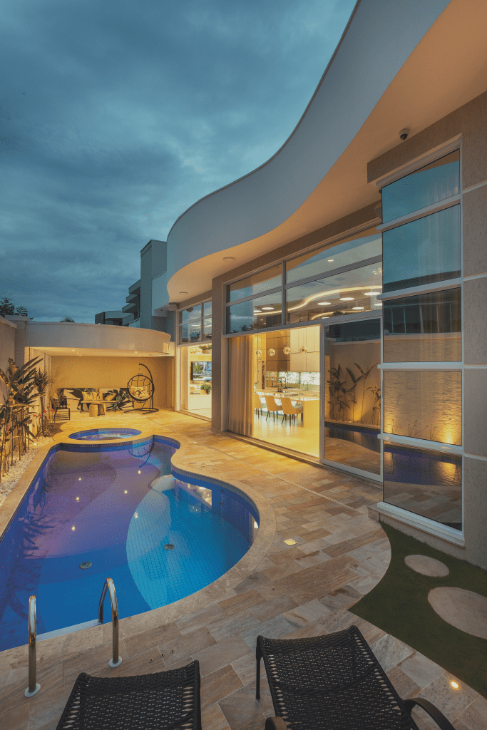 Toda esta estrutura está voltada para a piscina em formato orgânico, spa e uma área coberta,