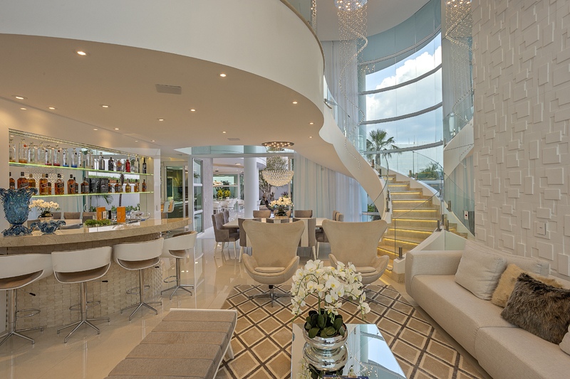 Living, bar, sala de jantar, sala de cinema e cozinha convivem harmoniosamente lado a lado, proporcionando sensação de amplitude e provendo o convívio social. Na entrada do living somos surpreendidos por uma parede escultural de revestimento 3 D. Um bar, com bancada curva, divide o espaço das salas de estar e jantar, além de conferir um charme especial ao projeto.