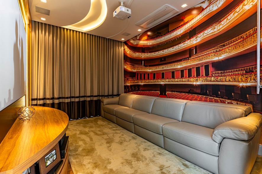 A sala de cinema está ao lado da sala de jantar. Um grande painel espelhado isola os ambientes quando fechado. Aberto, integra os espaços. Na ambientação do cinema, destaque para a imagem de um grande teatro na parede, que serve como cenário.