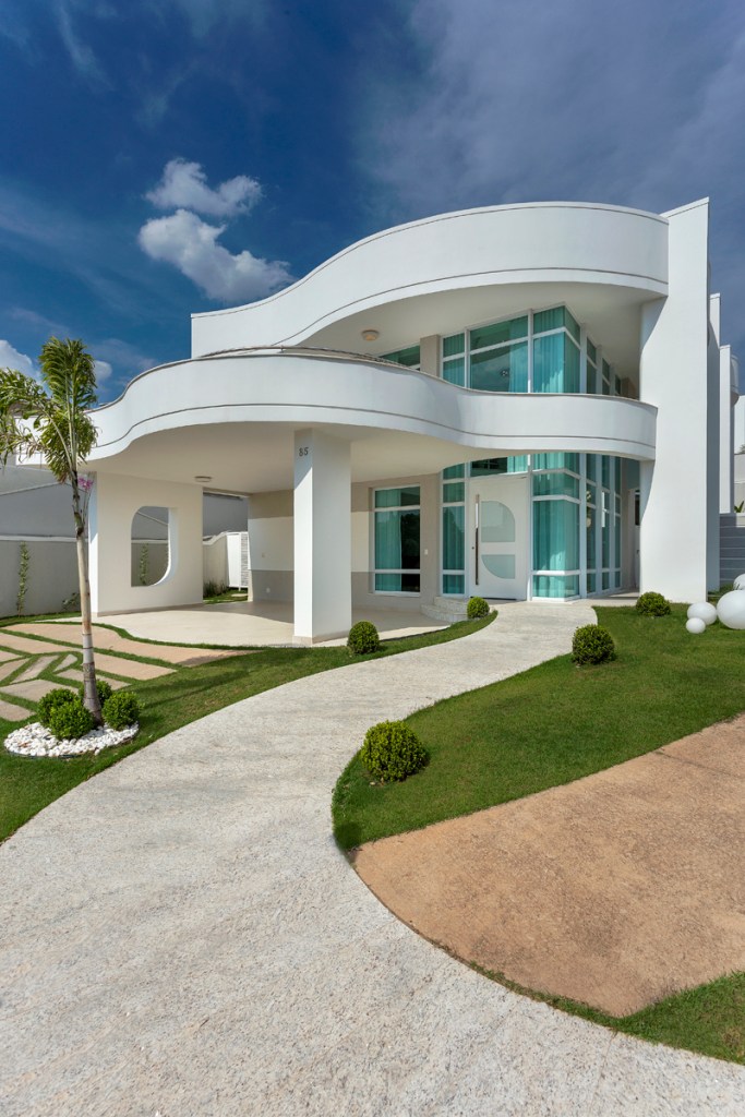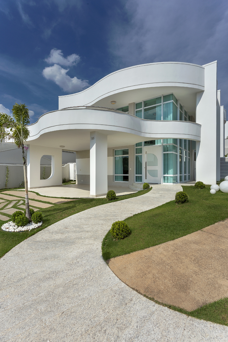 Na fachada, de pé direito duplo, os pilares além de terem a função de sustentar a casa, foram desenhados como esculturas rompendo o telhado. Uma viga aérea abraça toda a esquina, provocando a sensação de que toda a estrutura está suspensa.