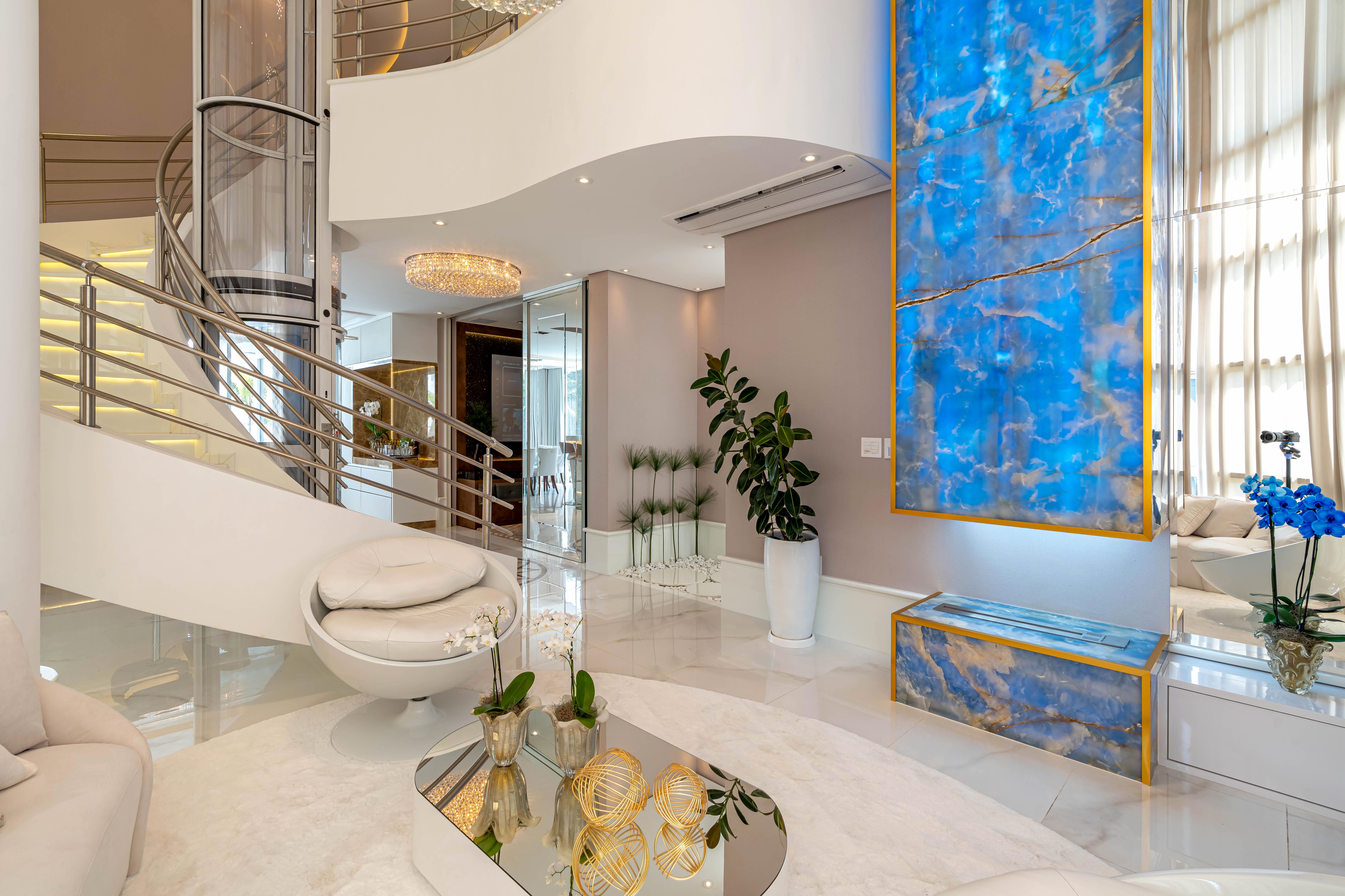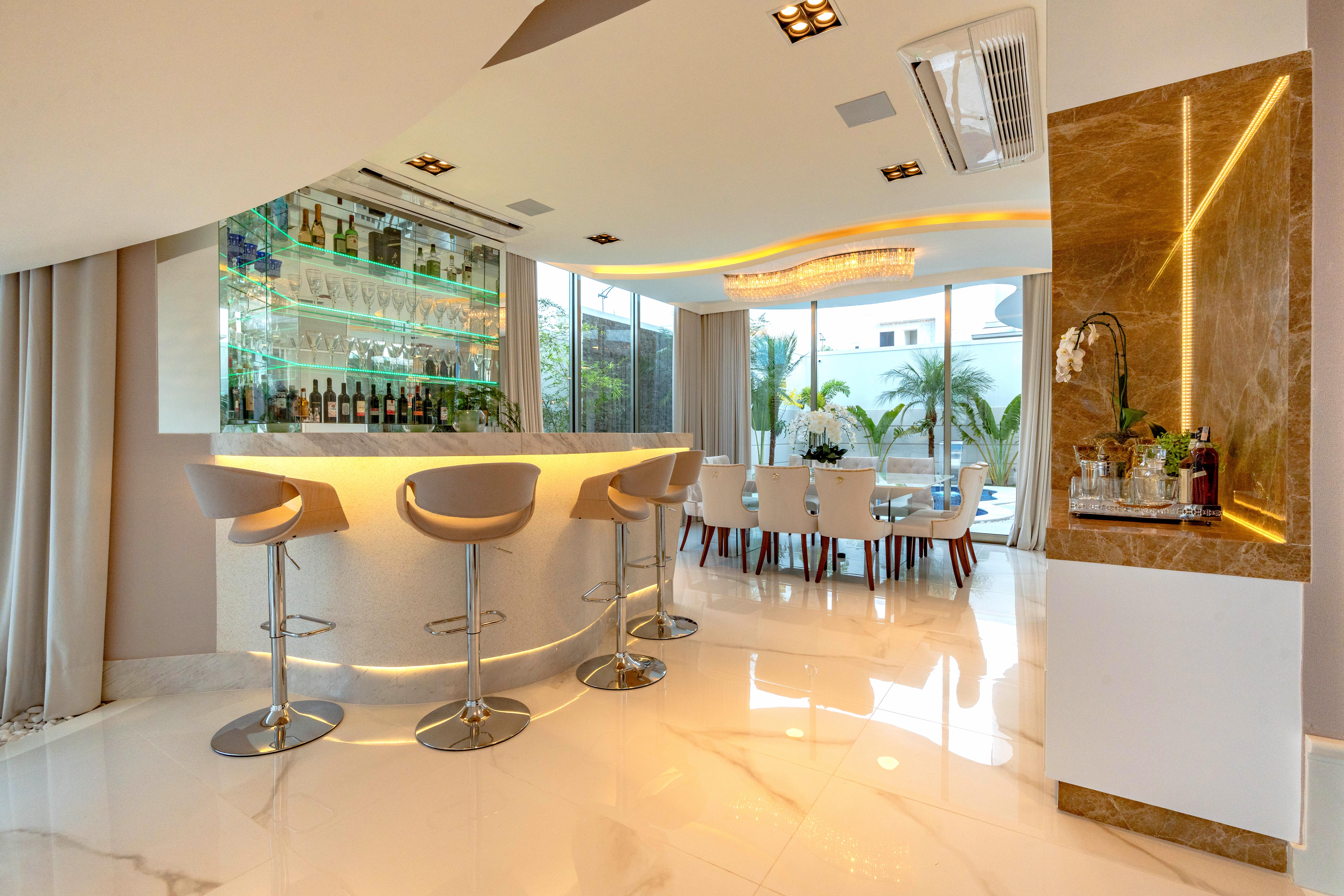 No piso superior estão localizados o mezanino e quatro suítes, incluindo a máster, com direito a sala de banho, closet e bancada de maquiagem. O espaço gourmet é integrado ao jantar e multifuncional, pois também é a cozinha do imóvel. Foi equipado com todos os eletrodomésticos além de churrasqueira, grelha, mesa de refeições e balcão.
