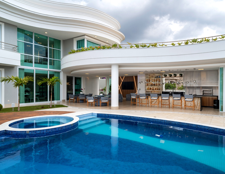 Ela foi ambientada com mesas para refeição, saleta, balcão sinuoso de refeições, infraestrutura completa de cozinha, bar e churrasqueira e piscina, spa e sauna voltada para o espelho d´água e cascata.
