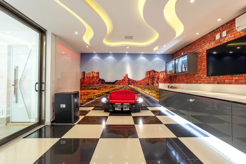 A Casa Mantiqueira tem uma área de lazer completa, composta por piscina e gourmet fica completamente integrada ao pavimento térreo, quando grandes portas de vidro se abrem. Balcão de refeições, churrasqueira, forno de pizza e chopeira complementam o espaço. Ela conta ainda com uma garagem temática com fotos de carros e estradas e um pequeno bar