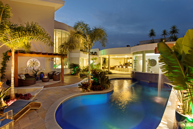 O sonho destes clientes era que sua residência, assinada pelo arquiteto Aquiles Nícolas Kílaris fosse voltada para natureza, com muito verde e espaços de lazer e contemplação. Assim nasceu a Casa Parque, toda voltada para incrível área de lazer. De qualquer ambiente podemos admirar o paisagismo exuberante, o lago com peixes, os diversos espaços zen e recantos para reflexão e relaxamento. O projeto luminotécnico produz um efeito cenográfico através da troca de cores e da iluminação especial do paisagismo e do lago.