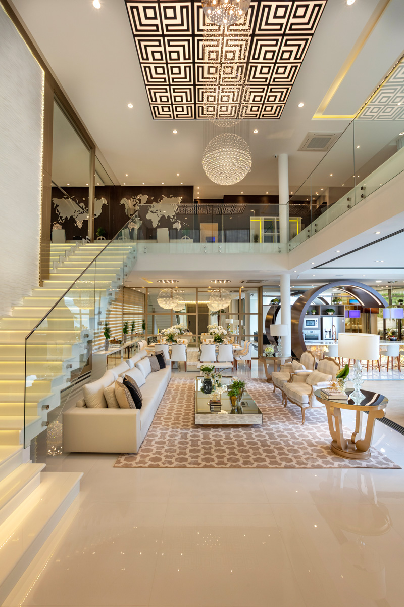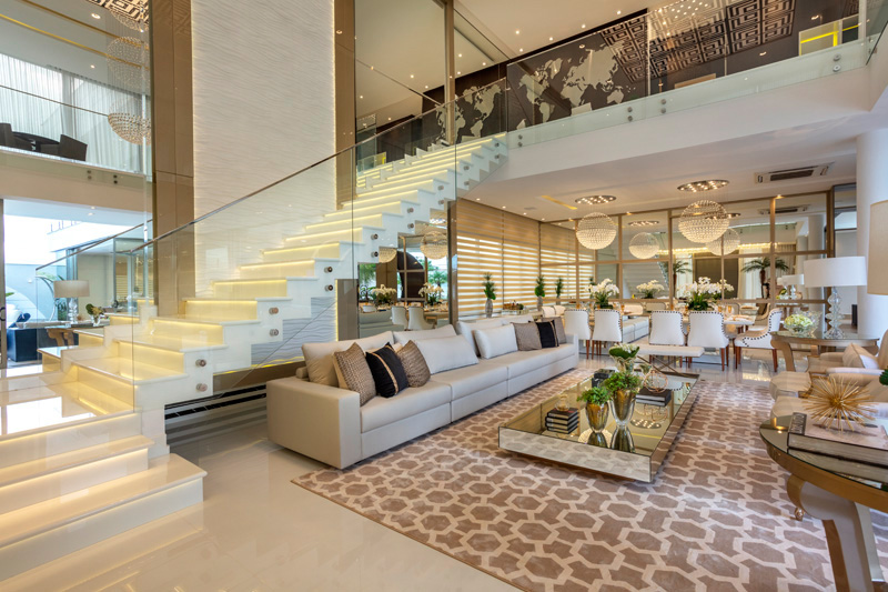 Um painel de espelhos atrás da mesa de jantar, esconde uma passagem para as suítes de hóspedes e máster. A máster, toda branca com detalhes em dourado, é composta por bancada com luz camarim, chaises para leitura, closet e uma sala de banho.