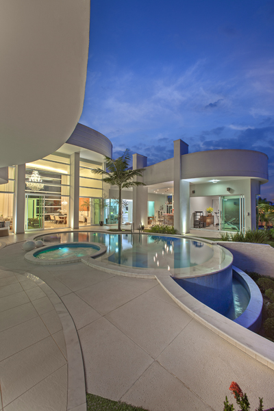 A área de lazer é completa, com piscina de borda infinita, spa, espaço gourmet com churrasqueira e um espelho d´água que foi construído no jardim, abaixo do nível da casa e da piscina. Ao seu redor, recantos de relaxamento e contemplação foram criados para proporcionar momentos de tranquilidade. Carpas foram usadas no lago para trazer ainda mais vida ao ambiente.