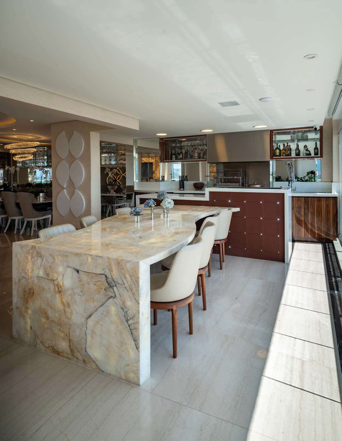 Um grande painel com espelhado separa a cozinha da área social. Quando ele está totalmente