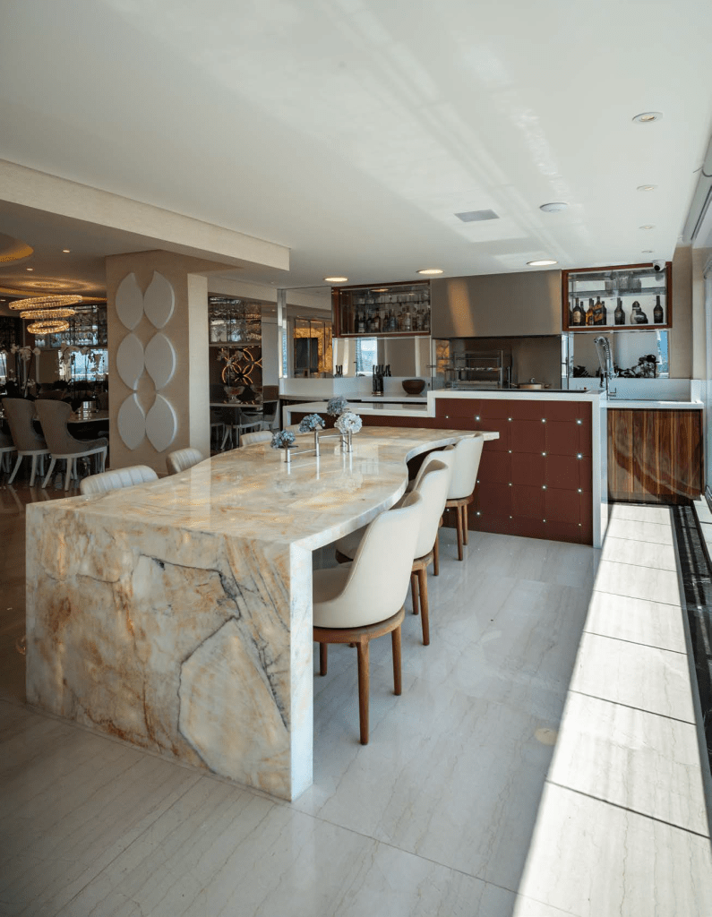 O gourmet do Apartamento Anita, assinado pela designer Iara Kílaris, recebeu estrutura completa, churrasqueira, pia, fogão, armários, refrigeradores e um grande cooler para encher de gelo e bebidas durante as festas. Uma mesa balcão, toda sinuosa, também compõe esse espaço.