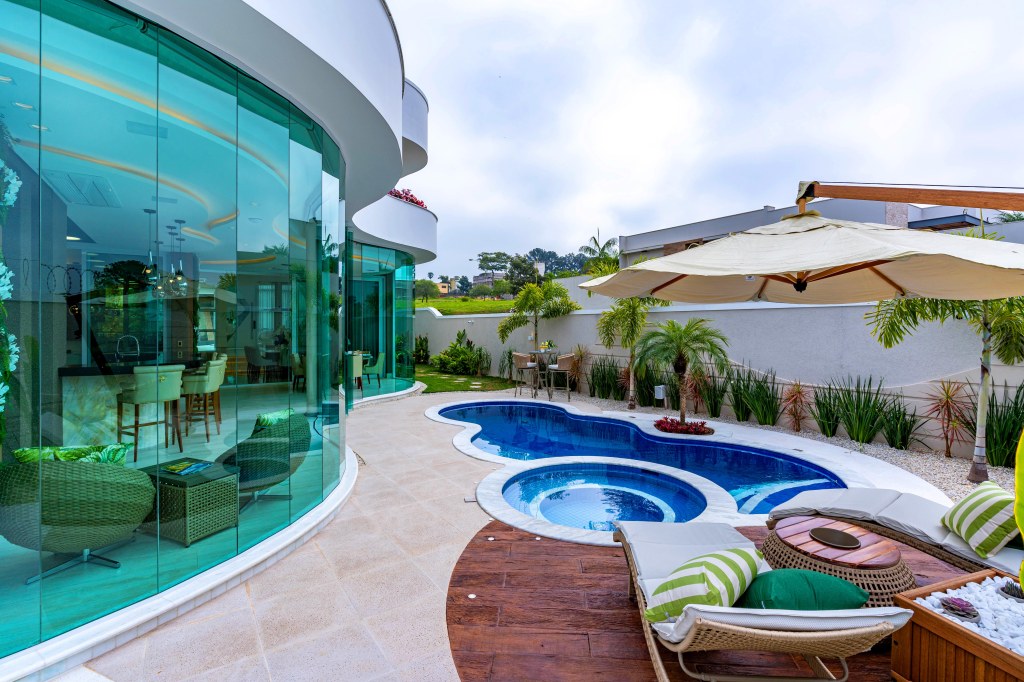Subindo as escadas, encontramos o mezanino e três suítes, sendo uma máster com sala de banho e grande closet. Na varanda superior máster, um grande estar com sofá. A área de lazer paradisíaca é envolvida pelo jardim tropical, recantos de contemplação voltados para o projeto arquitetônico, espaço gourmet e piscina. Destaque para o gourmet completo, com churrasqueira, revestimento com pedra iluminada, bancada de refeições e integração com sala de jantar. A piscina tem formato orgânico.