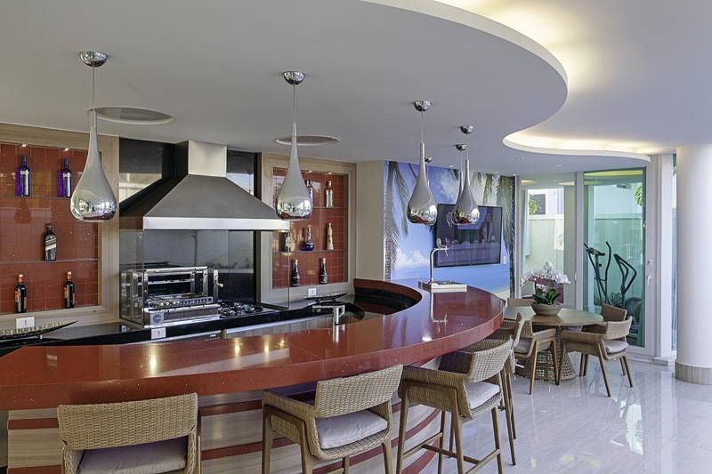 Construída em dois pavimentos, a parte térrea é completamente integrada. Living, jantar, home theater e cozinha dividem o mesmo espaço sem nenhuma porta ou parede. Todos estes espaços estão voltados para a área externa.