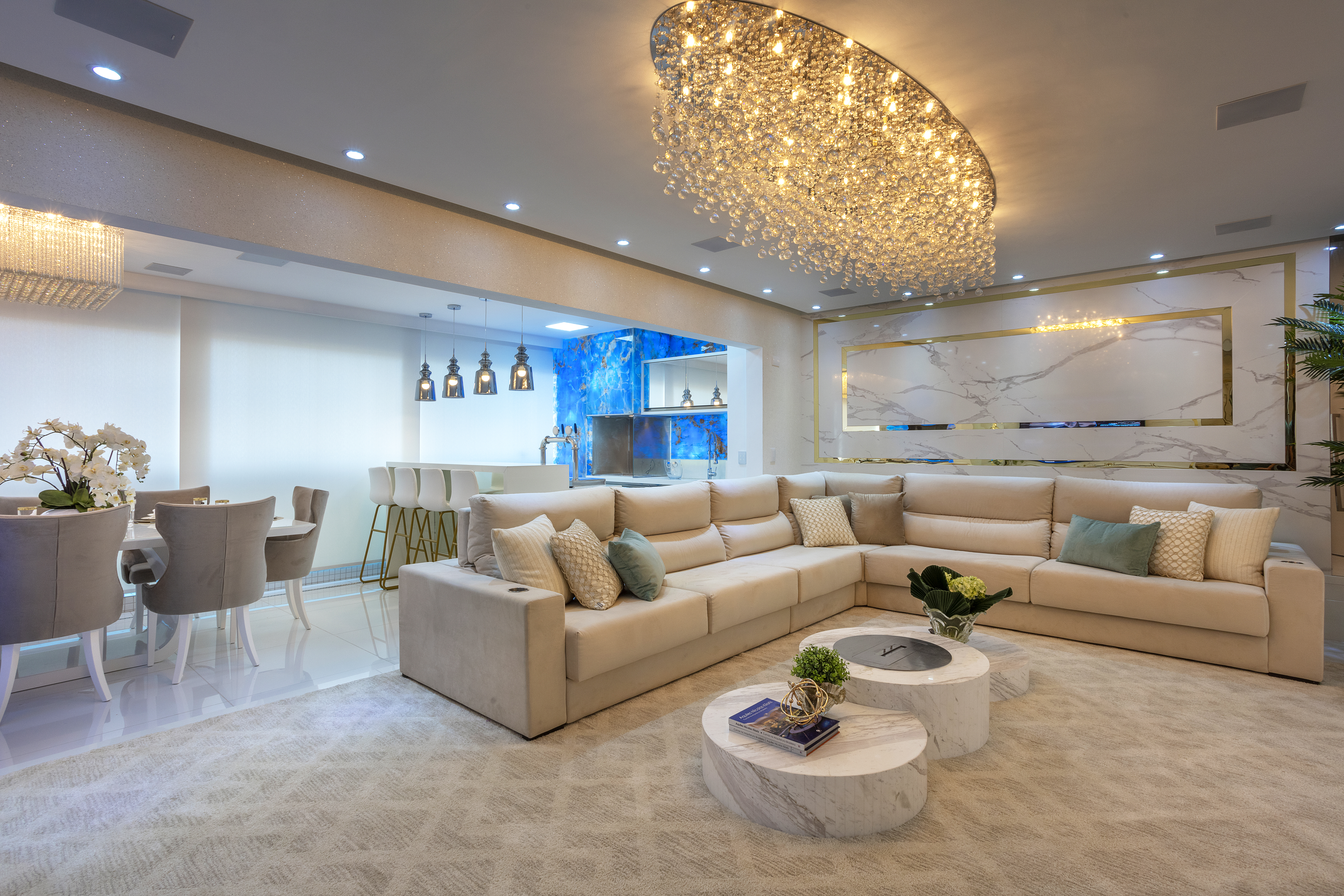 O conceito diferenciado está na na criação do gourmet, bar jantar, projetados lado a lado, sem perder a elegância. Essa área está integrada também ao grande living. A sala, enorme , tem paredes revestidas de mármore, que conferem requinte. A decoração foi idealizada com cores claras e dourado.