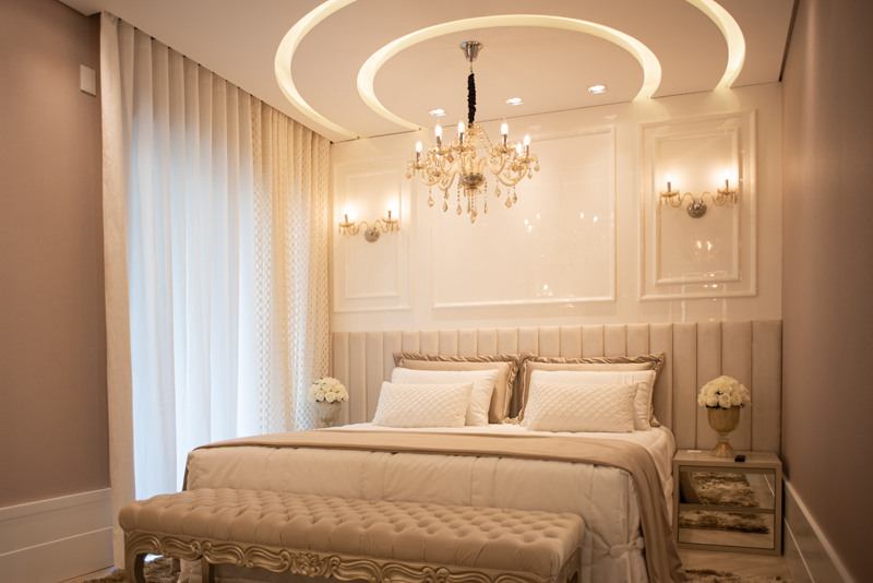A suíte máster do Apartamento Jardins, assinado por Iara Kílaris, tem cores claras, ar europeu e um projeto luminotécnico com proposta diferente. Ao invés de pendentes, nas laterais da cama, foram usadas arandelas na parede. O tecido da colcha se repete na cortina e uma TV de teto.
