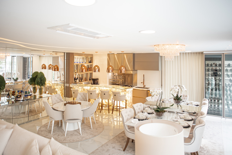 Com projeto de interiores assinado por Iara Kílaris, sua área social é toda integrada, living com TV, sala de jantar com uma grande adega, mesa de jogos e balcão bar/gourmet iluminado, com chopeira e churrasqueira. A coifa industrial resolve qualquer problema de cheiro e fumaça.