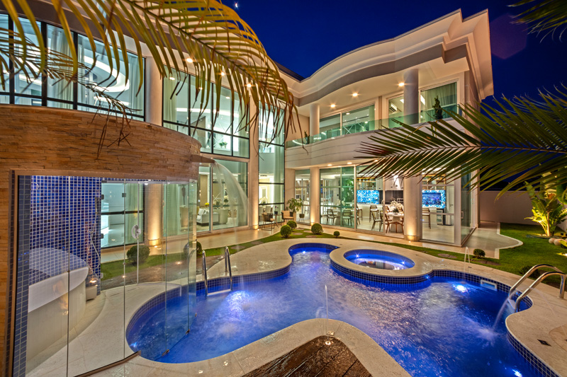Área de lazer da Casa São José, assinada pelo arquiteto Aquiles Nícolas Kílaris, é composta pelo espaço gourmet, spa e uma bela piscina em formato orgânico. Graças a transparências das grandes “paredes de vidro” desta residência, o lazer é cenário para todos os ambientes internos. O gourmet inspirado no mar, tem bancada sinuosa que remete ao movimento das ondas e na parede revestimento de pedras azuis iluminadas.