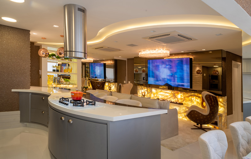 Por se tratar de um imóvel mais compacto, a varanda gourmet foi integrada à cozinha, recebendo uma única e grande bancada curva com cooktop, usada também para refeições rápidas. De um lado armários, torre para dois fornos e geladeira; de outro churrasqueira e chopeira. A sala de jantar foi ambientada na varanda, deixando assim mais espaço para o living.