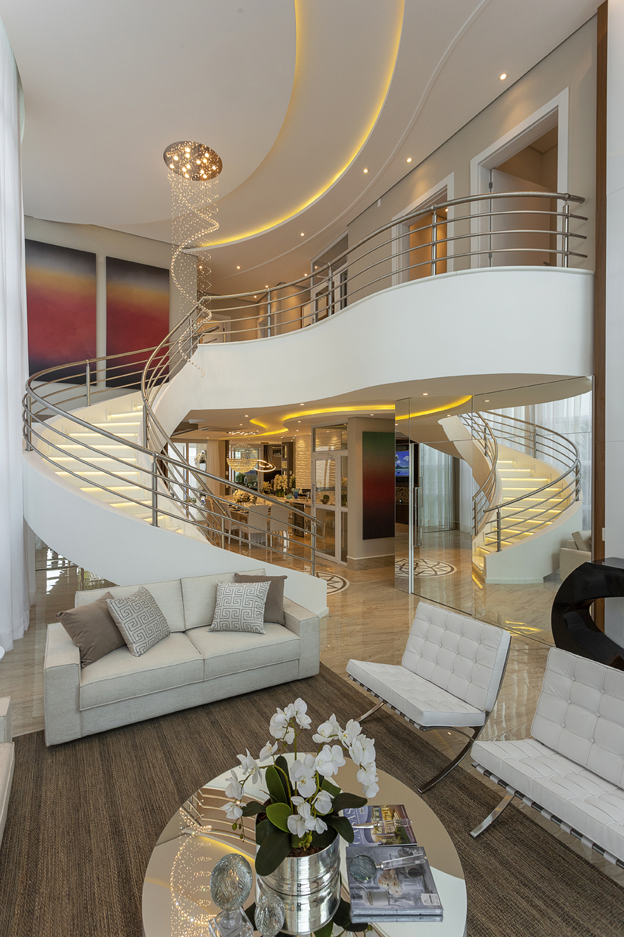Localizada em um condomínio fechado na cidade de Campinas, a Casa Esplêndida possui uma arquitetura muito diferenciada, pois as curvas se dobram no concreto esculpido do imóvel. Construída em dois pavimentos, pé direito duplo e muitos panos de vidro, a residência é imponente. Com a assinatura arquitetônica do arquiteto Aquiles Nícolas Kílaris, a área social é toda integrada e a base da decoração é clara, com tons neutros.