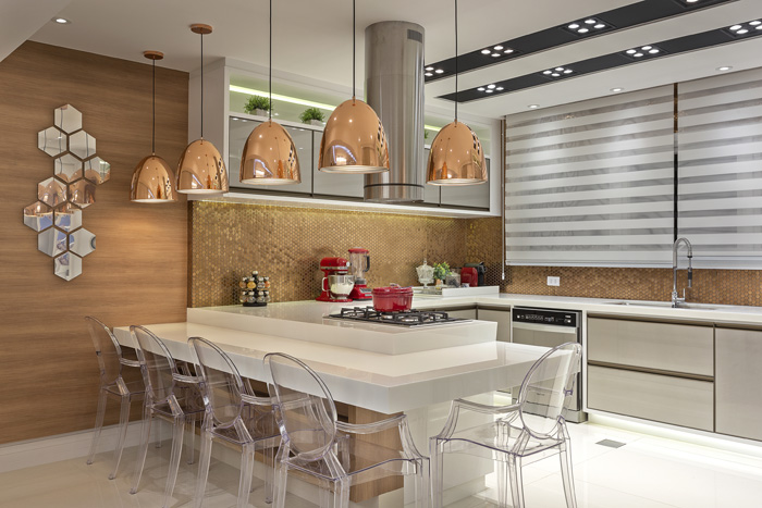 No Apartamento Ônix, assinado pela design Iara Kílaris, a integração é total. Living com TV, sala de jantar, cozinha e varanda são integrados, formando um grande e confortável espaço. A porta de correr espelhada, separa jantar e cozinha. Quando aberta, os ambientes se fundem. Fechada a porta, a elegante cozinha, toda em branco e bronze, com ilha e bancada de trabalho, fica preservada.