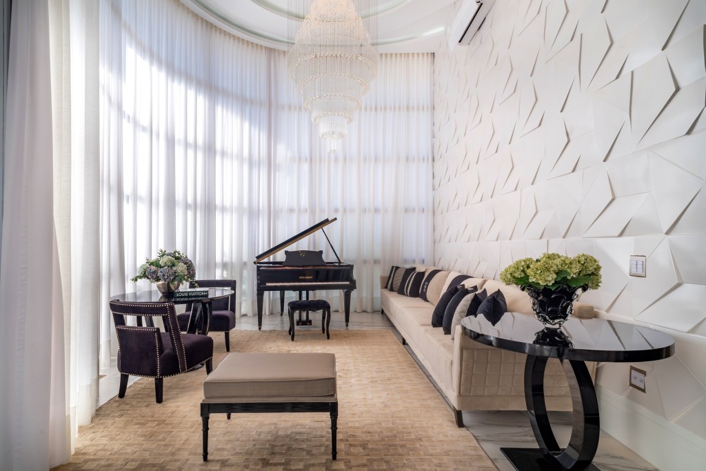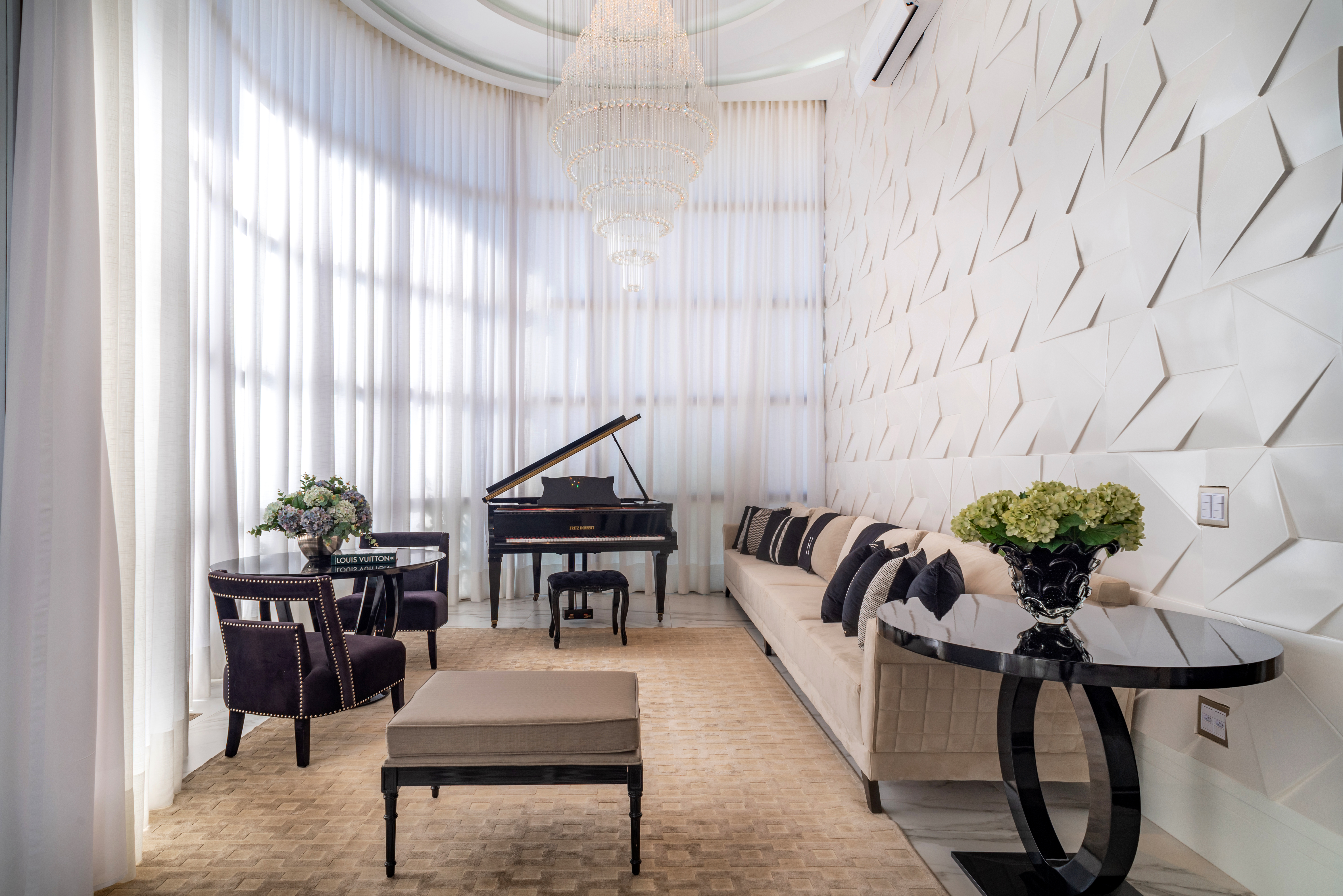 Logo na entrada, somos recebidos pela Sala do Piano, toda em branco e preto para acompanhar a elegância do instrumento musical, que é a estrela do ambiente. O suntuoso living com painéis de mármore revestindo as paredes complemente o estar da casa.