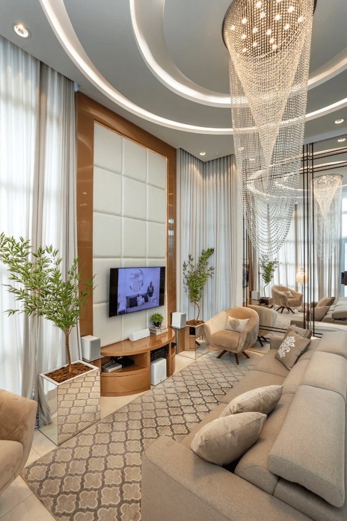 Ao entrarmos, somos recebidos por uma sala, com altíssimos panos de vidro, que reúne a beleza do living ao aconchego da sala de TV. Um grande painel de espelho é o responsável por isolar esta sala da área gourmet, ou promover a integração total destes espaços quando estiver aberto.