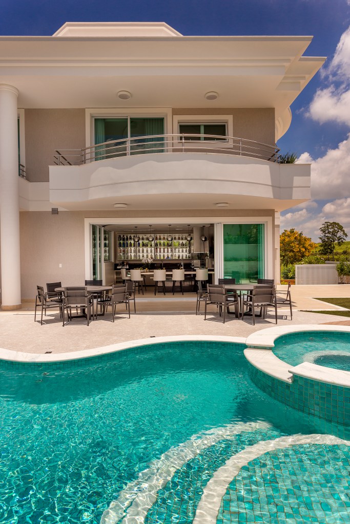 A área de lazer da Casa Clássica, assinada pelo arquiteto Aquiles Nícolas Kílaris, está integrada com os ambientes internos da residência. Uma grande porta de vidro integra a área de lazer, que é cenário para os ambientes internos. Ela é composta por espaço gourmet, piscina em forma orgânica, vestiários e academia.