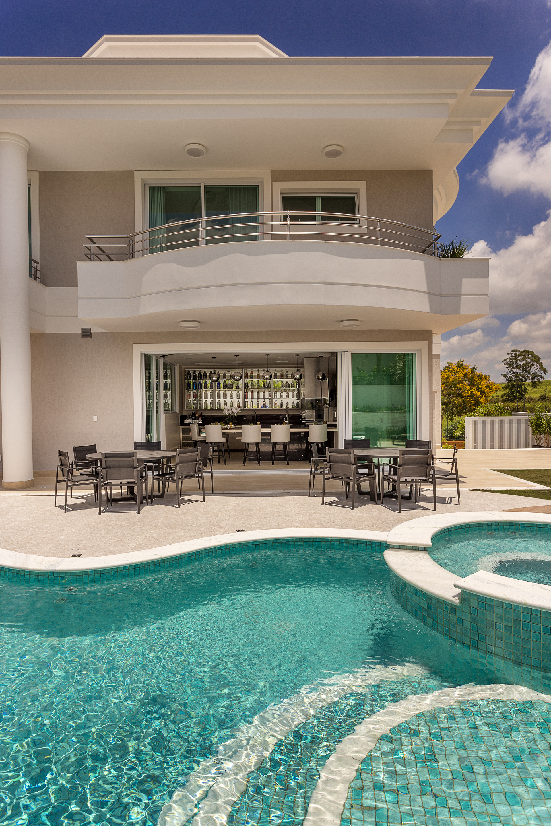 A área de lazer da Casa Clássica, assinada pelo arquiteto Aquiles Nícolas Kílaris, está integrada com os ambientes internos da residência. Uma grande porta de vidro integra a área de lazer, que é cenário para os ambientes internos. Ela é composta por espaço gourmet, piscina em forma orgânica, vestiários e academia.