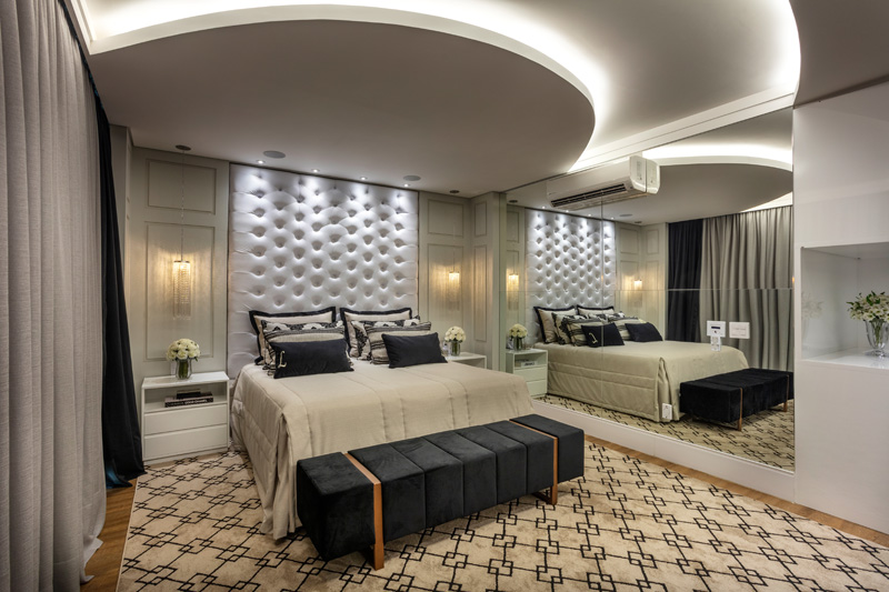 A Suíte Máster da Casa São José, projeto assinado pelo arquiteto Aquiles Nícolas Kílaris, é aconchegante, ampla e completa, com closet e sala de banho. A entrada para a suíte é feita pelo closet, que tem vários armário espelhados, tanto para “ele” como para “ela”. O espaço possui ainda uma bancada de maquiagem exclusiva.
