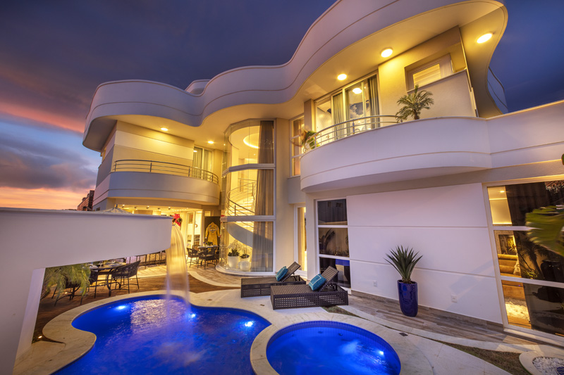A área de lazer da Casa Olivito, assinada pelo arquiteto Aquiles Nícolas Kílaris, está integrada com os ambientes internos da residência. Uma grande porta de vidro integra a área de lazer, que é cenário para os ambientes internos. Ela é composta por espaço gourmet, piscina em forma orgânica e pergolado com queda d’água.